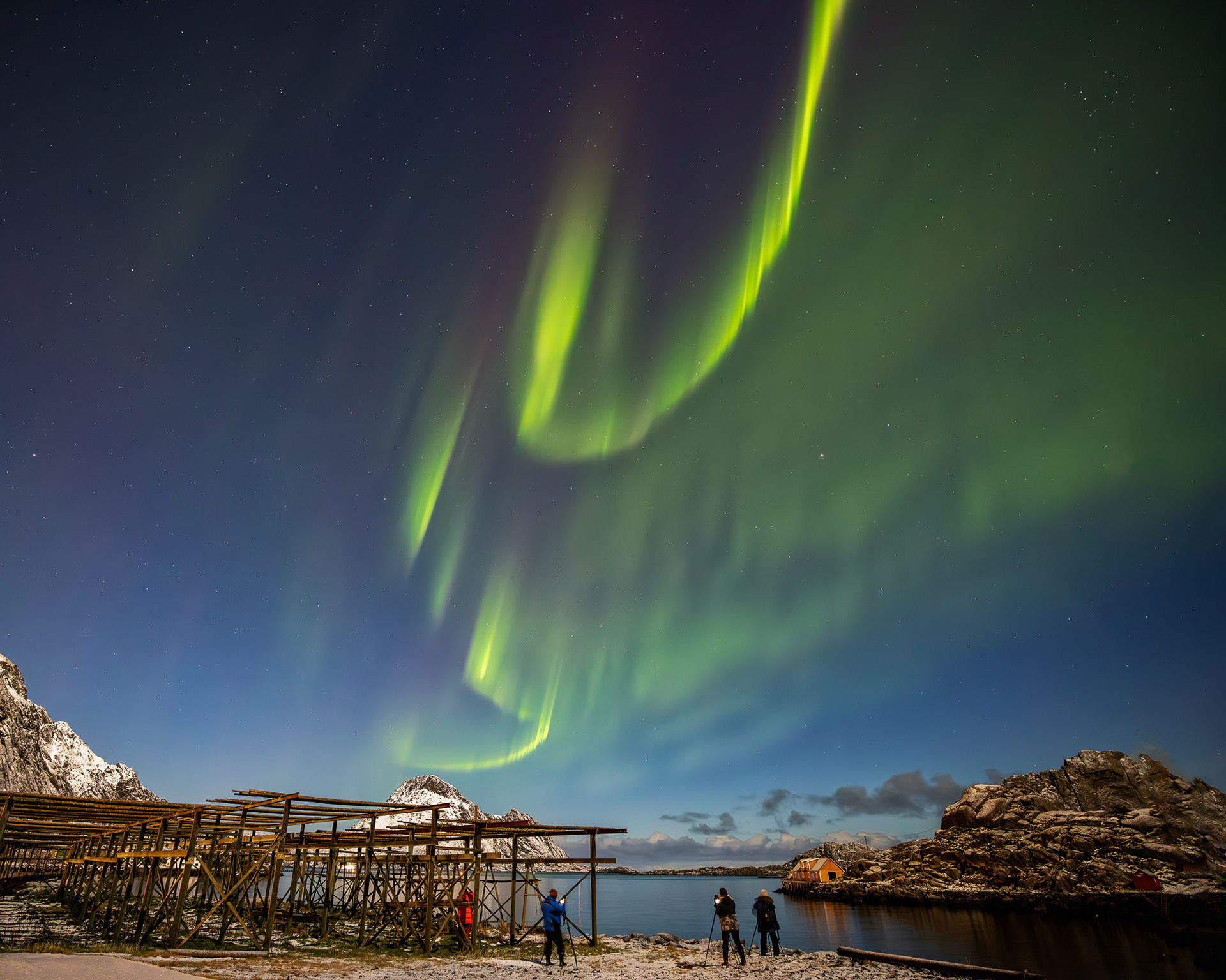 3 cormorants admire the view.... The Lofoten Islands are north of the Arctic circle and are comprised of bays, fjords, mountains and yes, some fertile farmland. The islands themselves are actually the eroded tops of partially submerged mountains. I swear every direction we looked there were mountains, and we often saw the water surrounding them. While in the Arctic CIrcle, Lofoten benefits from the gulf stream and so it doesn't get severely cold there...usually. Unfortunately for the group that followed us the week after we were there, Lofoten was slammed by Storm Ingunn which had winds equivalent to a level one hurricane.
